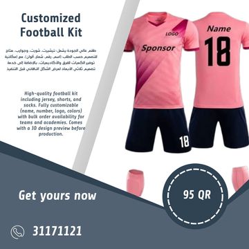 Personalized football jersey & shorts with full sublimation printing. Fabric: breathable polyester, quick-dry technology. Available in all sizes (Kids: 4–16 years | Adults: S–XXL). Name & number printing included. Delivery: 10–14 days.